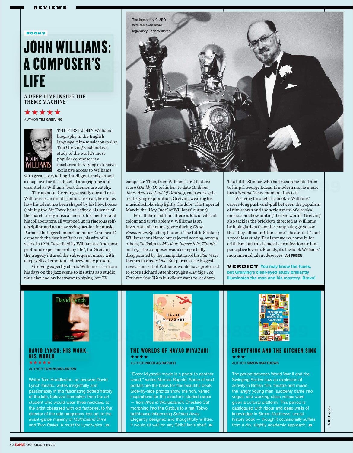 with great storytelling, intelligent analysis and a deep love for its subject, it’s as gripping and essential as Williams’ best themes are catchy. … It’s not a toothless study. The later works come in for criticism, but this is mostly an affectionate but perceptive love-in. Frankly, it’s the book Williams’ monumental talent deserves.” — Empire Magazine (October 2025)